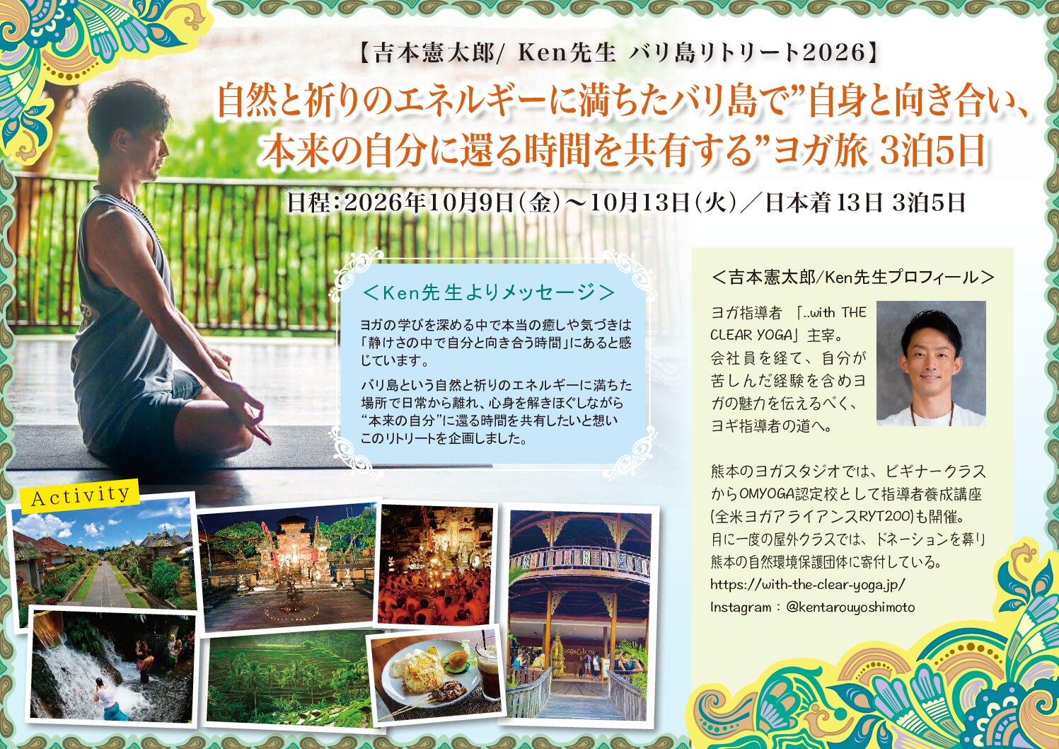 Ken Yoga_Bali_Retreat20262026年10月9日(金)〜13日(火)/ 13日日本着 3泊5日